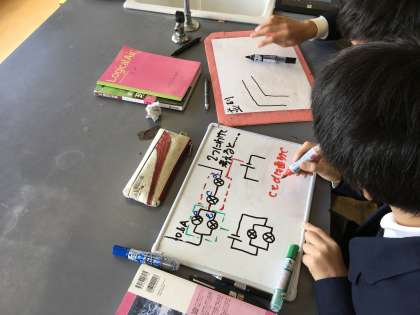 電球を直列につないだ時と、並列につないだ時の電流の大きさの比較を行いました。