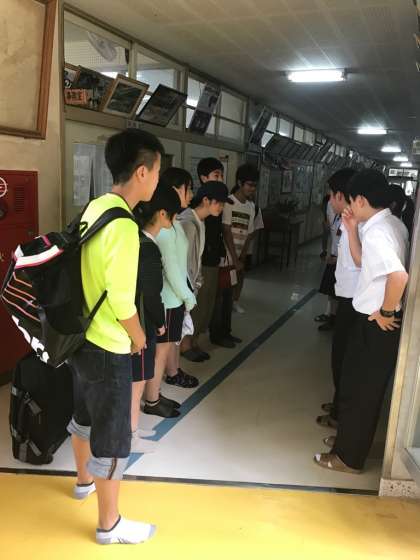 普天間中学校に到着しました。沖縄・普天間中の皆さんと京都・下鴨中の代表生徒とのすてきな出会いです。