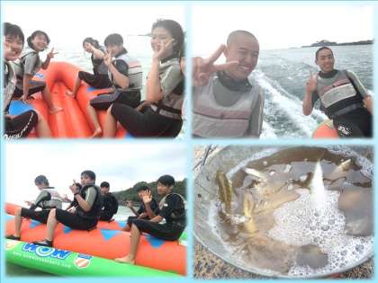 マリン体験の様子です!カヌー、バナナボート、ビスケットボート、ウインドサーフインを楽しんでます。浜辺は貸切状態で、ワーワーキャーキャーと歓喜の声が絶えません!