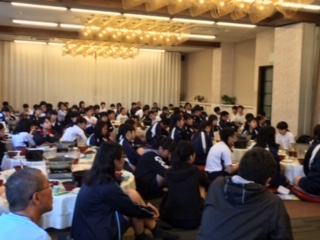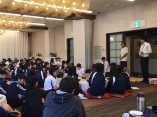 朝食を終え、宿の方へ挨拶、ご馳走様をし、連絡事項を聞いています。