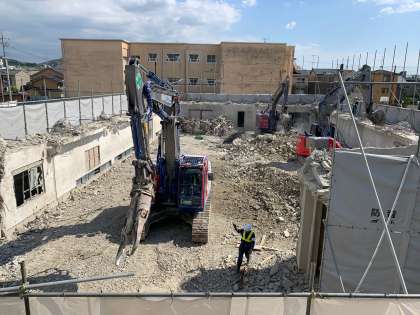 5月8日(金)体育館2階部分の東側の壁が崩されました。重機の台数も増え,壁を崩す重機,がれきをコンクリートや鉄を仕分ける重機,また,産業廃棄物をトラックに積み込む重機と役割分担されています。手際よく進んでいます。