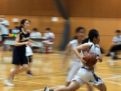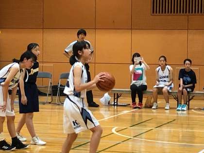 男子バスケットボール部に続いて女子バスケットボール部の試合が行われました。相手は烏丸中学。近衛は序盤からペースを握り,着実に得点を積み重ねていきます。前半が終わった時点で8点差をつけていました。後半に入ると圧倒的な力の差をみせつけます。フリースローは完璧にゴール。スリーポイントシュートが飛び出すなど,選手は思い切りのいいプレーをしていました。ベンチにいる選手も次々に交代。緊張することなく伸び伸びとプレーしていました。最終的には20点以上差をつけたワンサイドゲームでした。試合は残り少ないですが,この試合のように勝敗云々よりも,伸び伸びとバスケットを楽しんで欲しいものです。