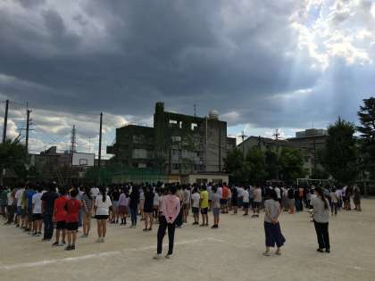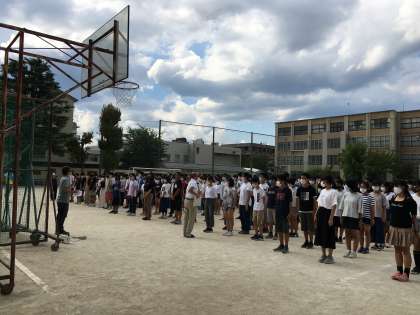 8月31日(月)7限「防犯訓練」を行いました。放送が入ってから,全校生徒がグランドに避難するまで2分47秒。素早い避難でした。校長からは刺股(さすまた)を紹介。「実際に生徒が使うことはないが,登下校中に刃物を持った相手に襲われた場合は,身の回りの持ち物,たとえばカバンとかで防がなければならない場合もある。担任の先生から『いかのおすし』の話があったと思うが,『もし,自分が襲われたら,そのときどう対処するか。』ということも考えてみて欲しい。」という話をさせてもらいました。安全な世の中であって欲しいですが,痛ましい事件が起こっているのも事実です。今日の防犯訓練を単なる知識ではなく,「もし,自分の身の回りで起こったら」という想像力に発展させてください。