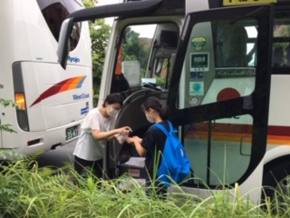 荷物を運転手さんに預けて担任の先生の体温チェックを受けて、手の消毒。