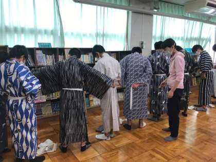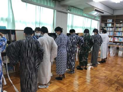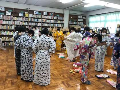 1年生の家庭科の授業の中で,和装体験が実施されました。家庭科の先生以外に5名の講師の方に来ていただき,お世話になりました。日頃着なれない和服に「こうかなぁ?これでよかったのかなぁ?」と戸惑いながら,いつもと勝手が違う姿は,とても微笑ましくも感じられました。生徒たちは先生や講師の方の話をしっかり聞いて,体験活動をしていました。