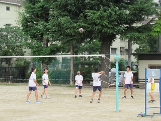 3年生はグランドで元気よくバレーボールです。暑くもなくちょうどいい天気で,男女混合チームで円陣パスをしています。ボールを落とさないように,慎重に声を掛け合いながら続けていました。さすが3年生,ずいぶん続いていました。