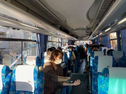 実行委員長の生徒が、「はめを外さないように」と、先生からは「運転手さんが安全に運転してくださってるから、ちゃんと座ること、声の大きさを考えておしゃべりを楽しむこと」などの諸注意がありました。