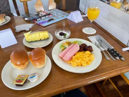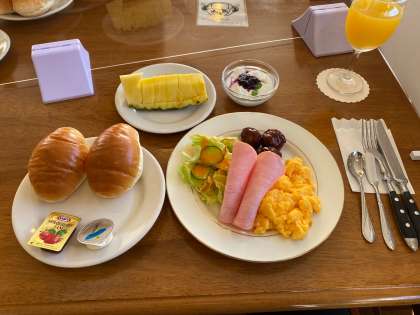 本日の朝食です。ペンションらしく洋食ですね。食べ盛りのみんなは朝からおかわりしてるかな?