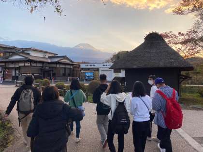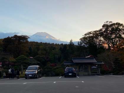 謎解きツアー(フィールドワーク)終了です。富士山も夕焼けですね。忍野八海さようなら!!