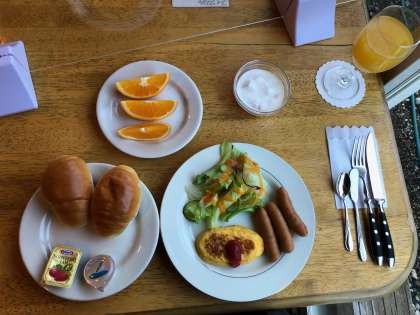 最終日、ソーセージ、オムレツ、サラダ、パン、ヨーグルト、オレンジです。