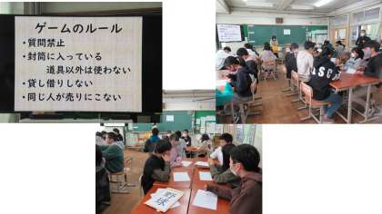 貿易ゲームが始まりました。各班で〇△□半円などサイズの決まっている図形を作り,商社へ持っていき,売ってお金をもらいます。しかし班(国)にある道具には差があります。ある班は「紙,分度器,はさみ,鉛筆,定規すべて揃って図形をつくる班」があれば,「はさみと紙しかない班」「えんぴつと紙しかない班」みんな班の中で知恵を出し合い,必死で図形を作ろうとします。持って行っても,商社からいろいろ注文をつけられ,うまく稼ぐことができない班があります。