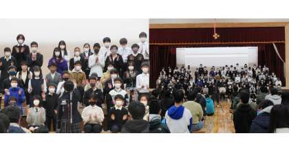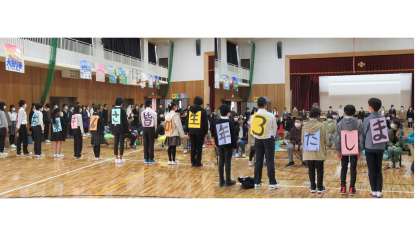 ハンドクラッピングです。このコロナ禍に声を出さないピッタリの出し物です。しかも1年生全員の息がピッタリと合っていなくてはできない素敵な贈物でした。そのあと1年生は移動し3年生を囲み,背中に貼ったメッセージを順番に見てもらいました。最後にドカーンと紙吹雪も舞って,3年生はとても喜んでくれました。