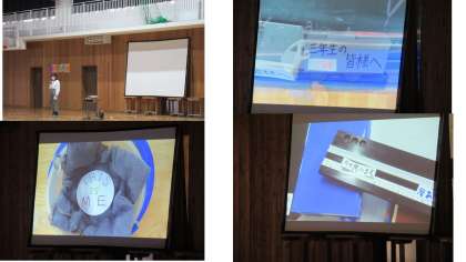 2年生が作った「ピタゴラスイッチ」での3年生へのメッセージのあと,