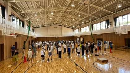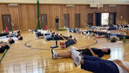 体育館での学年練習では、先日2年生の学年練習でもあったようにコロンと寝て、校歌を歌い、お腹のどこに力を入れたらいいかを感じてから練習でした。
