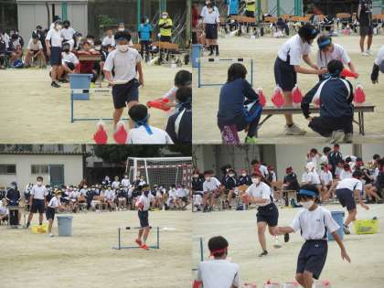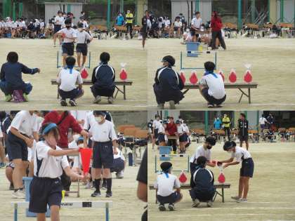 プログラム15、1年学年種目の「火消しリレー」カードを引いて、道具が指定されていてそれで水をペットボトルに入れ、一番多くペットボトルをいっぱいにしたクラスが勝ちという競技でした。