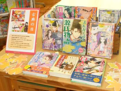 11月も半ば。紅葉の美しい季節。図書館だより11月号でも載せましたが、「古典の日」にちなみ、やさしい古典の本、マンガを並べています。