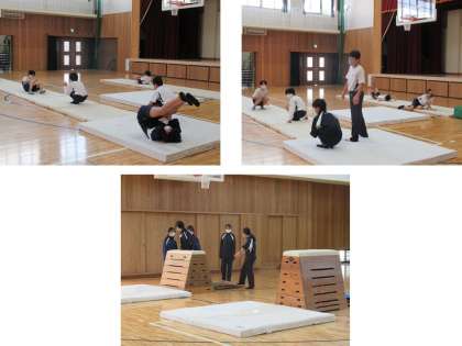 体育館では1年生が、マット運動と、跳び箱をしていました。