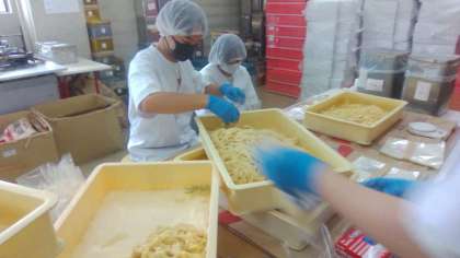 西尾八ツ橋では、八ツ橋を作ったときに出る切れ端を500g〜510gに計量し、袋詰めする作業をしています。まるで少しづつ500gの感覚を身に着けていく職人のようでした。以前はこの切れ端は廃棄していたそうですが、現在はファミリーレストランのビュッフェのデザートとして、あんこを添えて出しているのだそうです。どこかで出会ったときにはぜひご賞味ください。よくがんばっていました。
