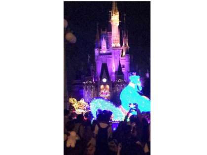 夜のパレードです。とてもきれいですね。アラジンもいますね。シンデレラ城も昼の姿とは異なり、なんとも不思議なな雰囲気ですね。