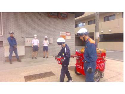 昨日は給水ホースを運ぶ練習をしました。消防車についても教えてもらっていました。