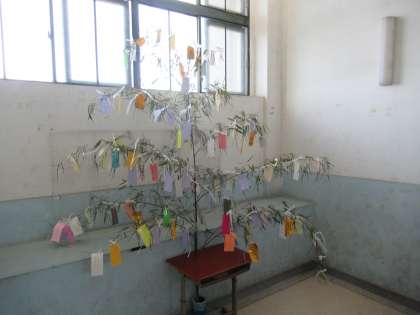 近衛中学校の階段ホールにも巨大ささが置かれ、みんなそれぞれの願いごとが出そろいました。願いごとはさまざまです。