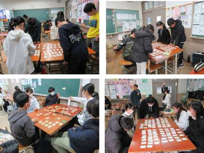 年を越すと「百人一首大会」があります。それに向けて、クラスの班ごとに百人一首の練習が行われました。ビックリしたのが、読み手も生徒がやっていたことです。またその読み方の上手いこと!!!すごいです!!