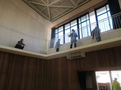 PTAの有志の方と各クラスから2名でてきてもらって、日頃あまり手が届かない、体育館のキャットウォークや体育館周りを念入りに掃除してもらいました。