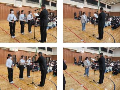 人権作文での優秀賞と吹奏楽部のアンサンブルコンテストで金賞を獲得した4人の人の表彰でした。いずれも2年生です。