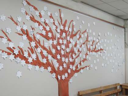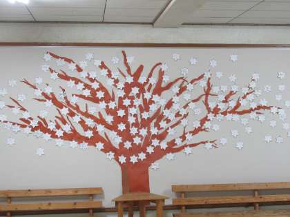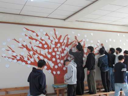 先日リニューアルした「このえの木」に全校の3学期の目標を、本日登校した3年生が咲かせてくれました。
