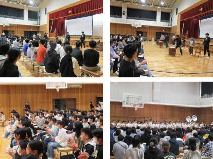 新入生歓迎会では、2、3年生が1年生に歌や劇などで歓迎しました。