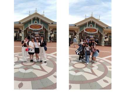 ディズニーランドに到着しました!!みんなテンションがあがっていますね!!入場前に写真を撮ってもらって、入場です!!夢の国 ディズニーランドで楽しんでね。