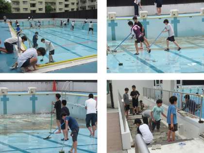 先日部活動でプール清掃を行う予定でしたが、すごい雨が降って、中止となってしまいました。プール清掃の経験がある3年生は修学旅行、2年生はチャレンジ体験・・ということで今日1年生の男子バスケ・男子デニス・卓球・サッカー・野球の部員でプール清掃をしてもらいました。すごいパワーで、あっという間にきれいにしてくれました。ありがとう!!全校がこれでプール学習を始められます。