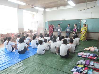 外部から講師の先生をお招きし、クラスごとに浴衣の着方の体験をしました。