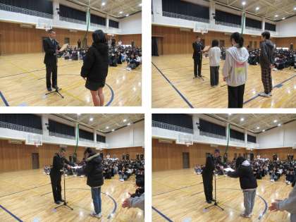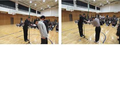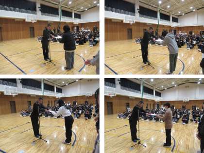 修了式の前に、またたくさんの近衛中生が表彰されました。卓球部、吹奏楽部、左京図書館での作品展示、書道。みんなあたたかい拍手を送っていました。