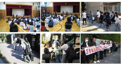 体育館で、修学旅行委員が中心となり結団式を実施し、みんなでこの旅行を一生に一回の思い出に残る旅行にしよう!と確認しました。