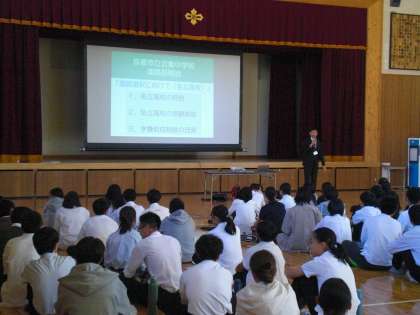今回は、私学の高校の説明を京都精華学園高校より教頭先生にご来校いただき、お話をいただきました。その後、本校進路指導主事より、令和8年度京都府公立高校入学者選抜要項についての説明をはじめ、今後の日程なども説明がありました。