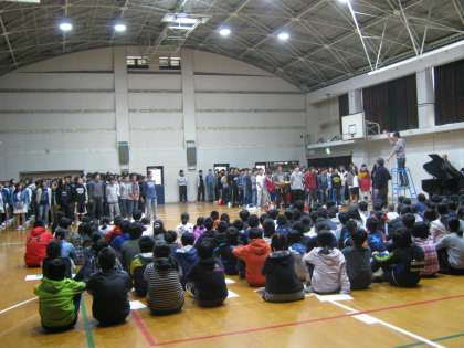 また,各クラスにはプレゼントとしてマジック1セットが贈られました。下の画像は,本部企画と2・3年の合唱の様子です。