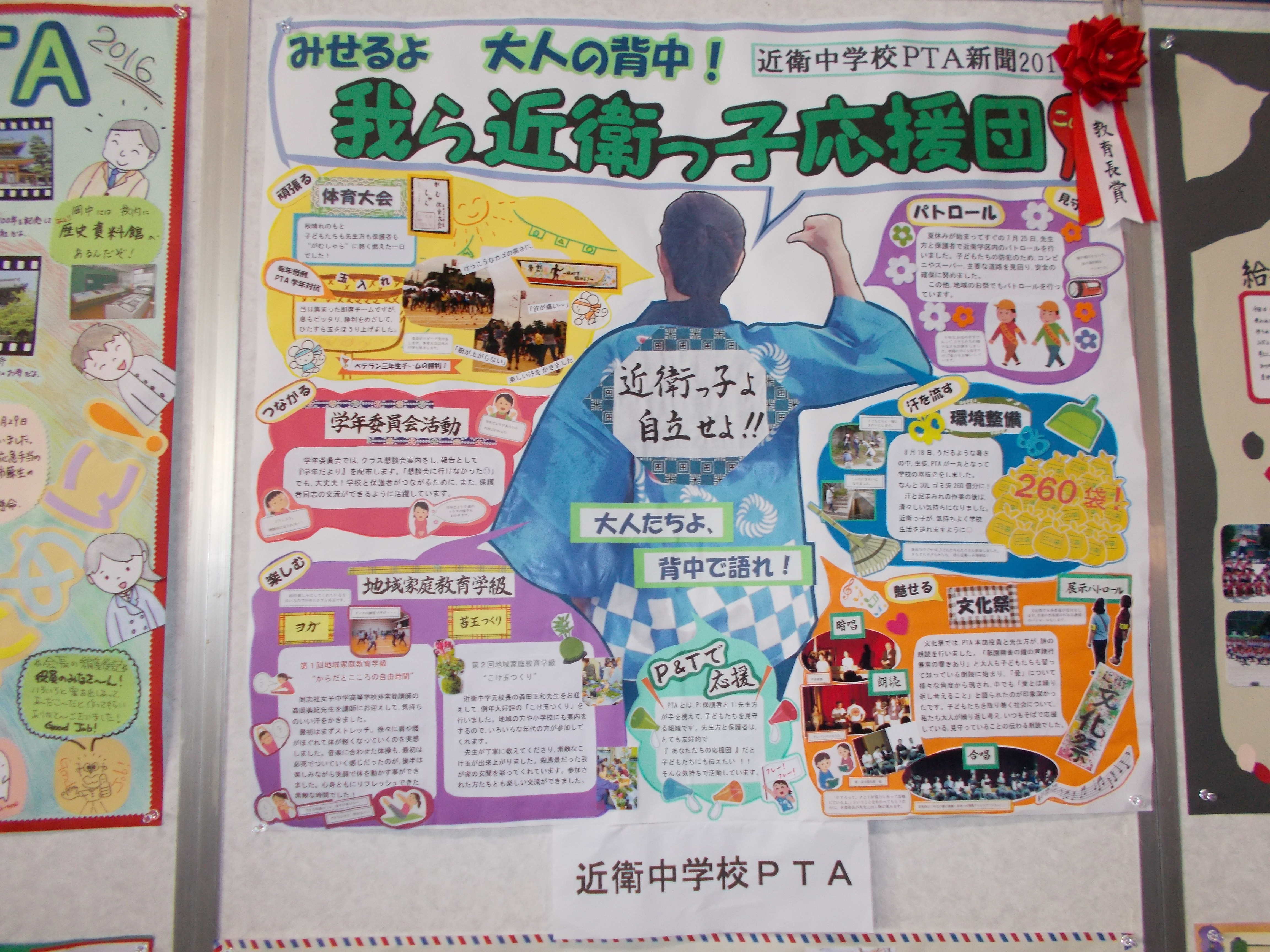 今年は,近衛中の壁新聞が『教育長賞』をいただきました。『教育長賞』というのは,『京都市長賞』『実行委員長賞』と並んで,全部で270校近くの内,『TOP3』に入る素晴らしい賞なのです。「とてもインパクトがあって,メッセージ性が強かった」とのお褒めのお言葉もいただきました。壁新聞作成にご努力いただきました広報委員さんはじめ関わって下さったPTA会員の皆様,本当にありがとうございました。そして,おめでとうございます。