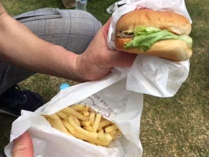 大村湾を眺めながら、昼食に佐世保バーガーを食べました。