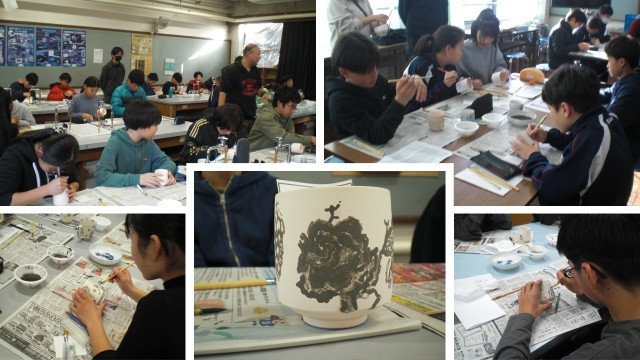 素焼きの湯呑みに、鉛筆で下書きし、ゴスというコバルトを原料とする絵具を使って、絵付けをします。濃いゴスと薄いゴスの2種類だけで絵柄を表現します。絵の具の状態では、茶色か黒に近い色ですが、焼成すると、美しい青になるそうです。湯呑に向かって、それぞれ思い思いの絵を描く表情は真剣そのもので、中には、字を書いている生徒もいました。