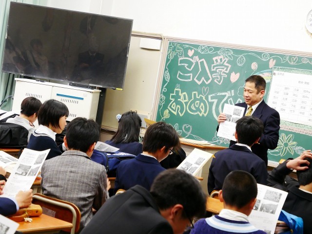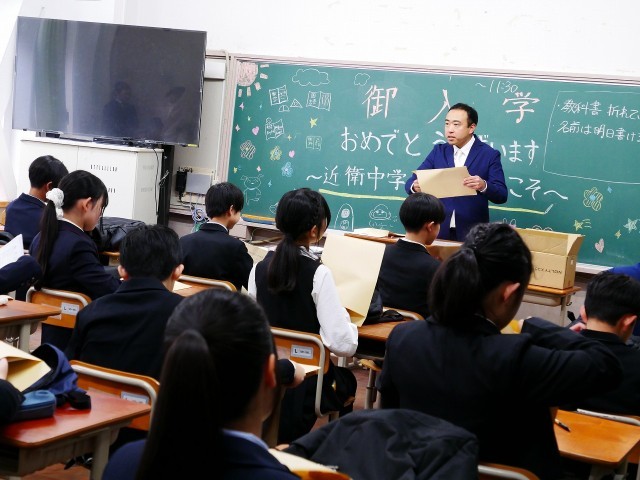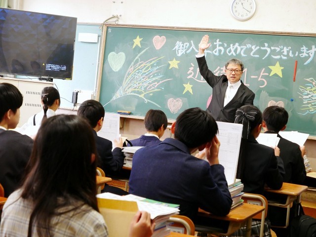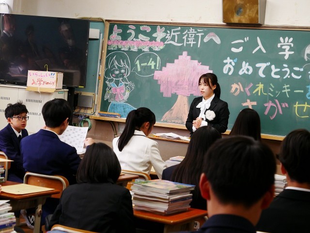 教室の黒板には、先輩たちからの「入学おめでとう!」のメッセージやイラスト、飾り付けが施されていました。