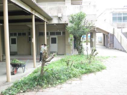 ということで,体育館と北校舎の間の木の枝を剪定されました。