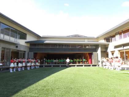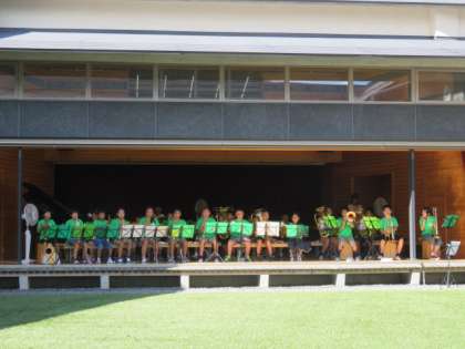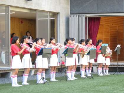 写真は,八瀬小児童による金管バンド「八瀬グリーンハーモニー」の演奏の様子です。修学院中学校吹奏楽部と一緒に,「ビリーブ」のコラボレーションもありました。