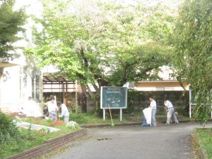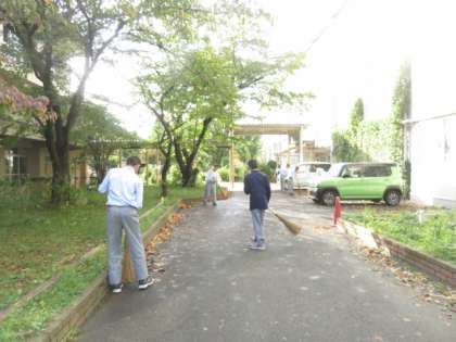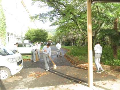 昨日の台風で落ちた落ち葉を男子バスケット部の生徒たちがきれいに掃き掃除をしてくれました。