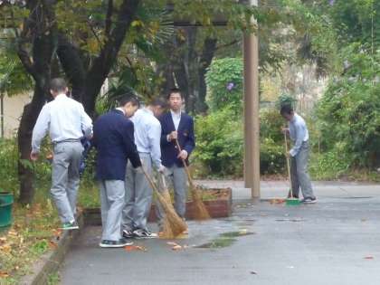 また,今日は,雨で落葉が掃きにくいにもかかわらず,男子バスケットボール部の数名の生徒が,昨日に引き続き校庭を掃き掃除してくれました。