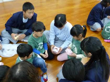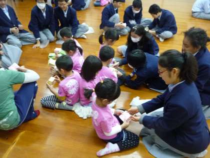 夏休みに作成したサイコロで園児さんが中学生から説明を聞いている様子です。