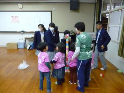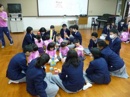 積み木を高く,いくつ積めるか,中学生と園児さんが協力している様子です。