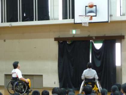 男女バスケットボール部の代表4名が,実際に車いすに乗って,車いすバスケットを体験しました。