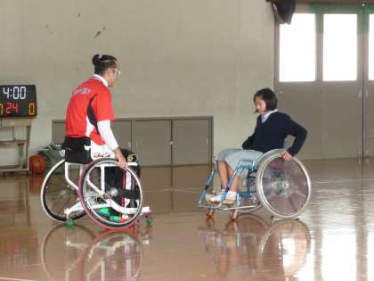 後半は,「車椅子バスケットボール」のゲームをしました。生徒は,5人対5人で,それぞれに選手の先生が1人ずつチームに加わってのゲームでした。生徒が,ゴールを決めようとシュートをするのですが,車椅子に乗りながらでは,なかなか難しく,ゴールが決まった時は歓声があがっていました。