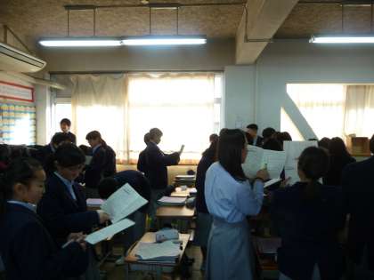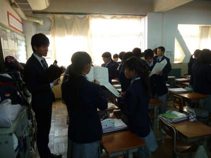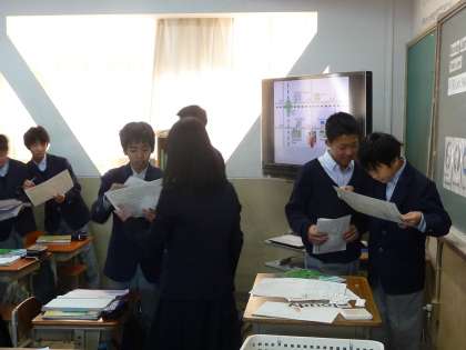 2人一組となって練習している様子です。案内役と外国人役になり,修学院地域の道案内をしています。